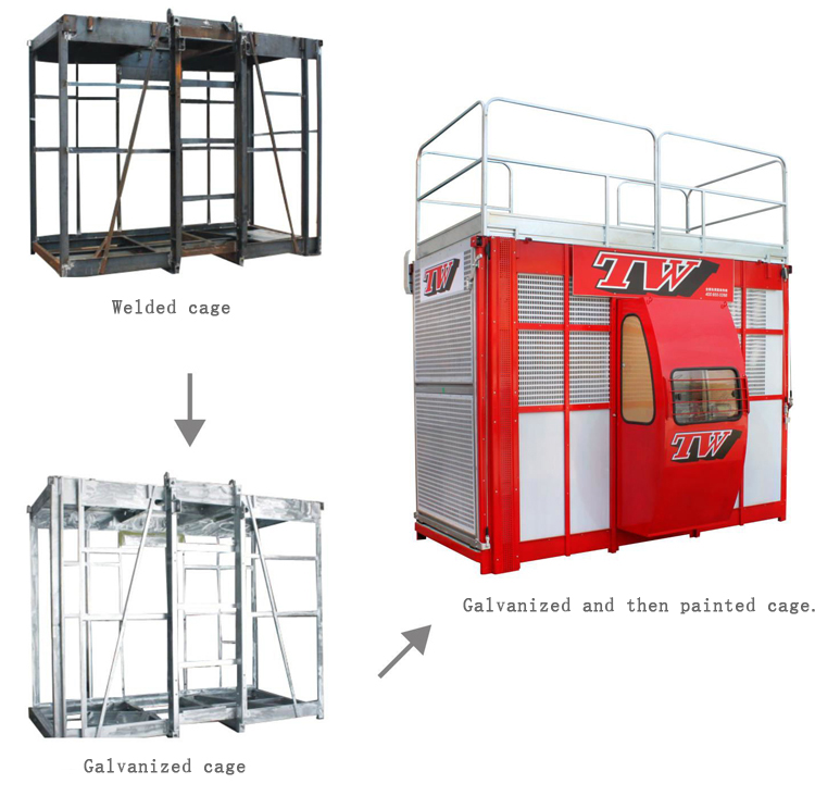 The cage structure is welded with a special tire, which is firm and strong. After the cage is welded, it is also treated with integral heat-diffusing zinc to ensure that the rust-proof performance of the cage is greatly enhanced, and the galvanizing is also painted. It not only guarantees a layer of rust, but also makes the cage more beautiful. Standard section options: standard section specification 650X650X1508, thickness 4.5/6.3/8/10 customers can choose standard sections of different thickness according to the height of the building. According to the user's needs, the standard section surface can be painted or hot dip galvanized (with relatively high strength and corrosion resistance). The rack is painted.